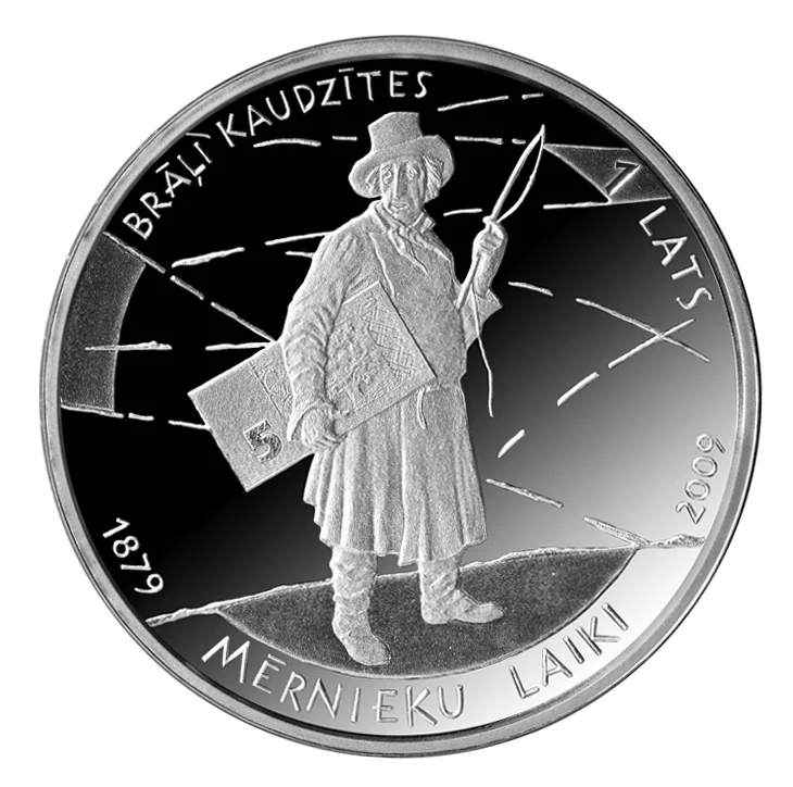 Kencis, holding a whip and a 5 lats banknote, is centered on the coin. The edge bears the inscriptions: 1 LATS, 2009, MERNIEKU LAIKI, 1879, and BRALI KAUDZITES.