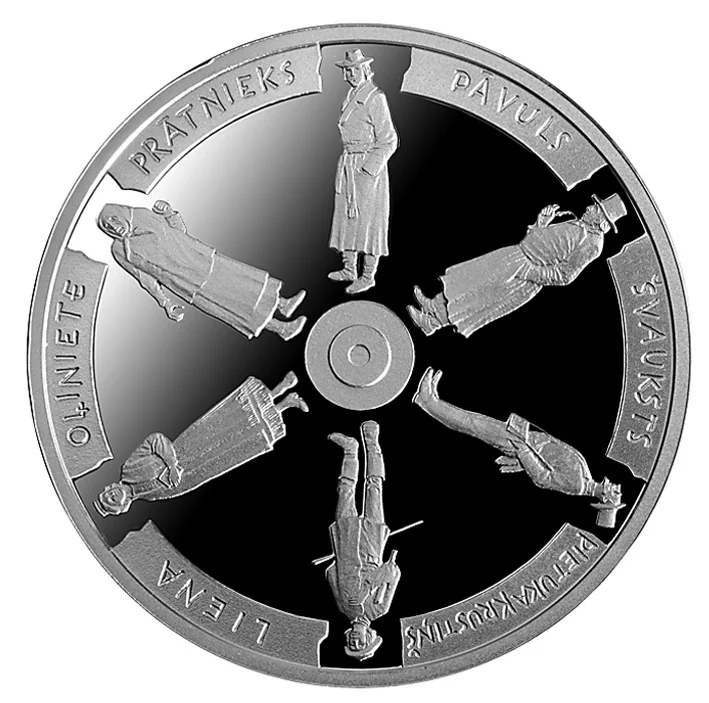 A central wheel hub is surrounded by characters from "Mernieku laiki" ("The Times of the Land-Surveyors"), with their names—PAVULS, SVAUKSTS, PIETUKA KRUSTINS, LIENA, OLINIETE, and PRATNIEKS—inscribed along the coin's edge.