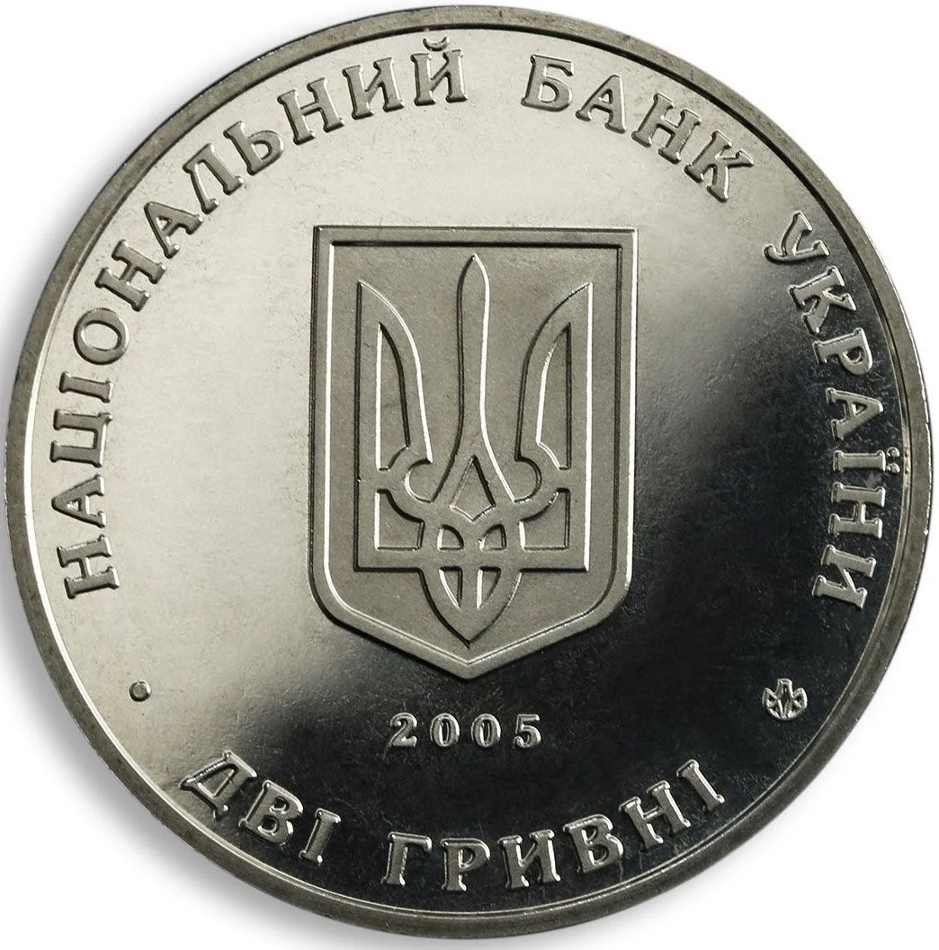 The small National Emblem of Ukraine is in the center, above the year 2005. Around the circumference are the inscriptions "НАЦІОНАЛЬНИЙ БАНК УКРАЇНИ" above and "ДВІ ГРИВНІ" below, along with the NBU Mint logotype.