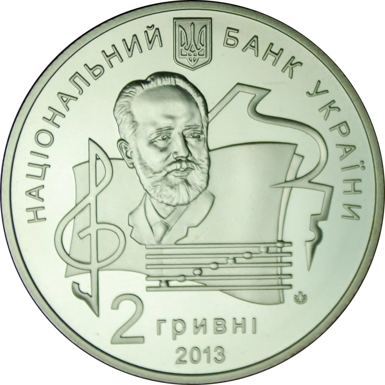 The obverse features Ukraine's Small Coat of Arms and the inscription "НАЦІОНАЛЬНИЙ БАНК УКРАЇНИ." A grand piano, treble clef, and staff frame a portrait of P.I. Tchaikovsky. Below are the face value "2 гривні," the Mint mark, and the year 2013.