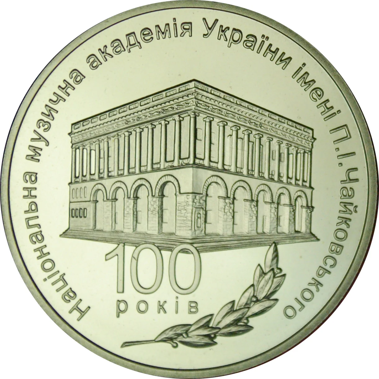 The mirror-finished background features the Opera Studio building of Ukraine's National Music Academy of Ukraine named after P.I. Tchaikovsky, with the legend "100 РОКІВ" and a laurel branch below.