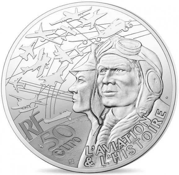Featuring two pilots, this tribute to aviation history profiles civil and military eras, represented by aircraft in the sky.
