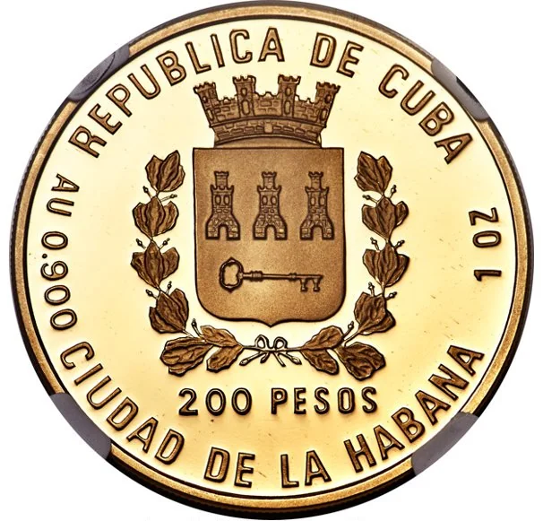 Havana's coat of arms, country name above, city name below, flanked by fineness and weight, face value beneath.
