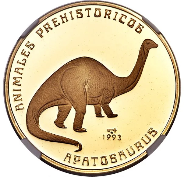 Apatosaurus facing right. Top: event name in curved text. Below: animal name, mintmark, and date.