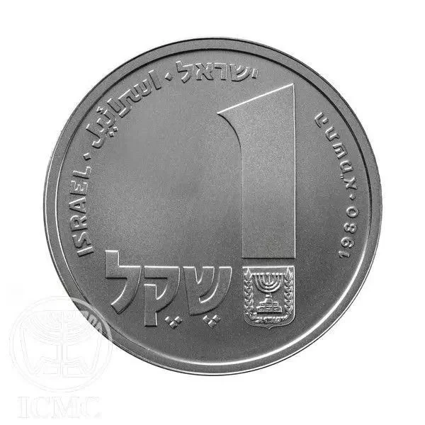 "1 Sheqel" in Hebrew with the state emblem. "Israel" in Hebrew, Arabic, and English. The dates 1980 and the Hebrew year 5741.
