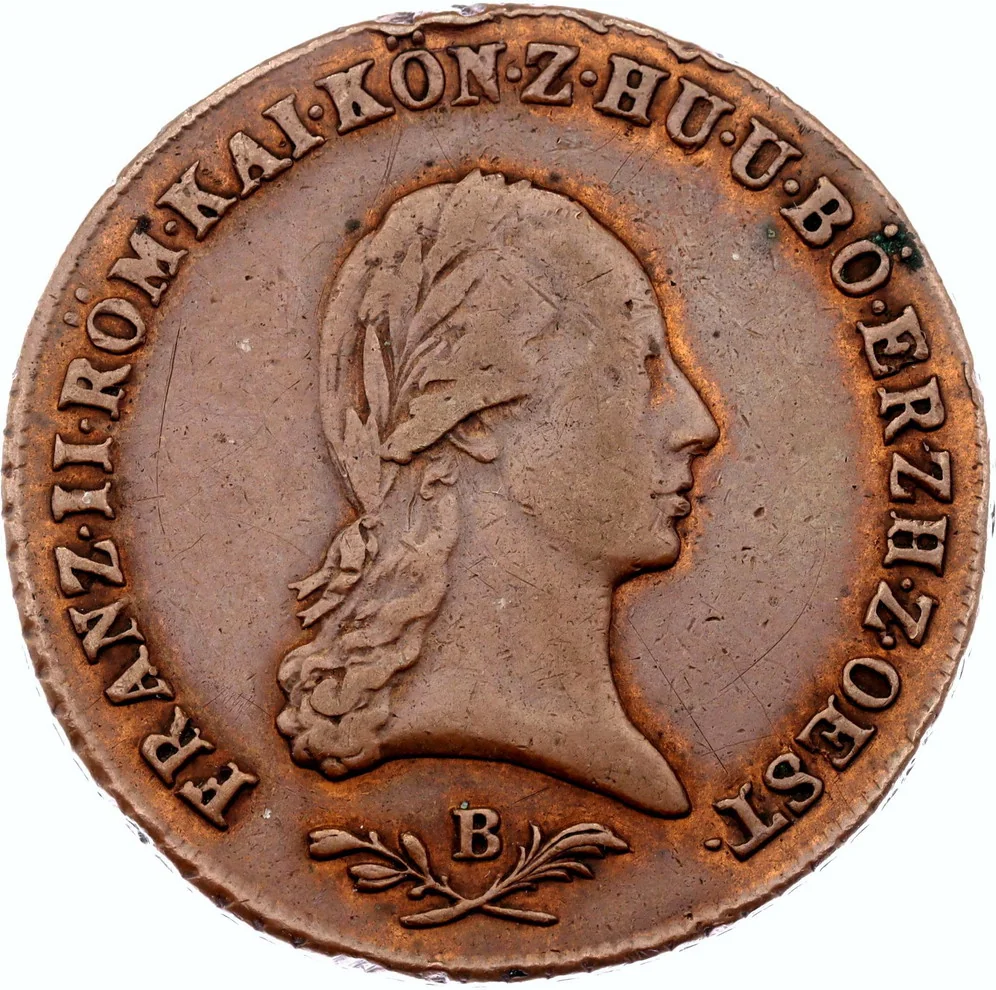 Portrait of Holy Roman Emperor Franz II of Habsburg facing right. Mintmark below bust, above crossed laurel and palm branches. German legend encircles.