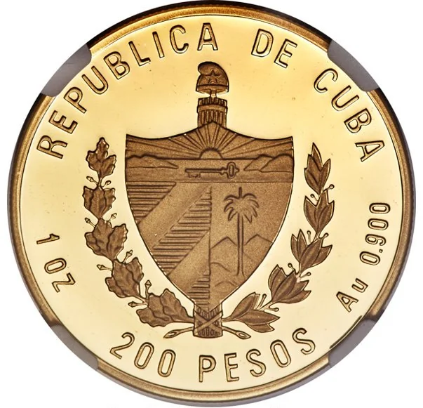 Cuban coat of arms, curved country name above, face value below; weight and fineness flanking.