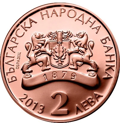 The obverse displays the BNB logo and "1879" on a central strip, encircled by "БЪЛГАРСКА НАРОДНА БАНКА," "2 ЛЕВА," and the issue year "2013."