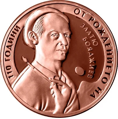 The reverse depicts Zlatyu Boyadzhiev before a palette, encircled by the inscription "110 ГОДИНИ ОТ РОЖДЕНИЕТО НА ЗЛАТЮ БОЯДЖИЕВ".