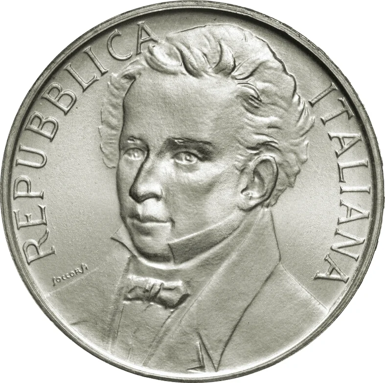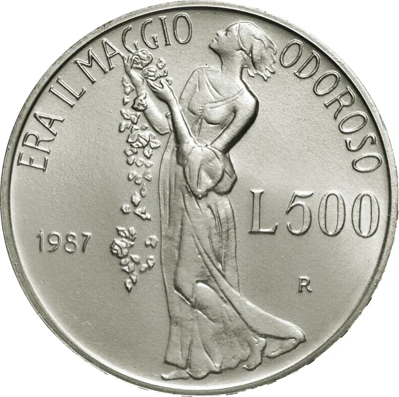 A woman stands, releasing rose petals—an allegory for Leopardi’s lyric. She separates the mintmark and value on the right from the date on the left, with a verse from “A Silvia” inscribed.