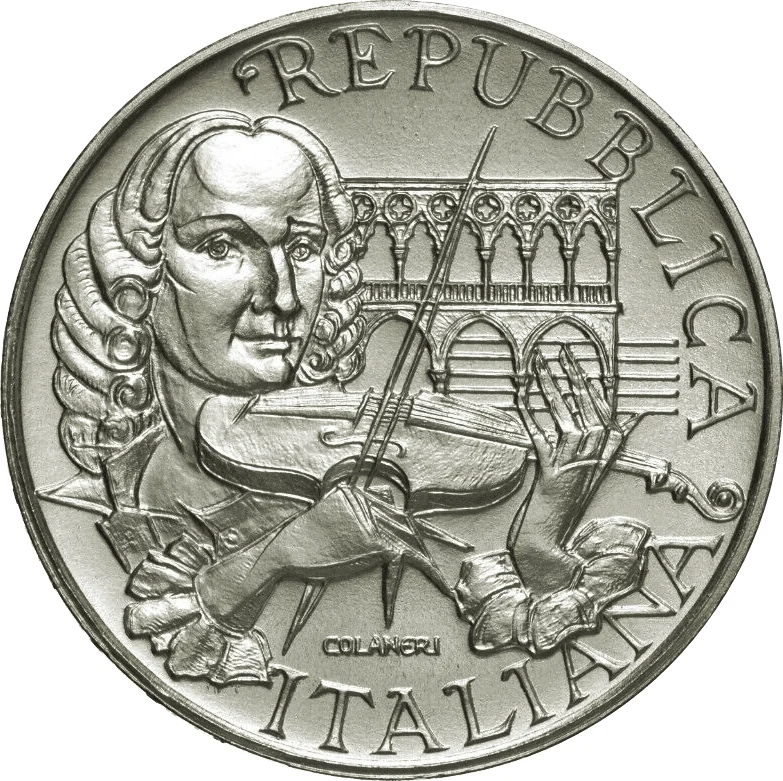 Description: A Venetian-inspired musical composition. Below, a pentagram becomes waves with a gondola. Above, the Rialto Bridge (right) with a pentagram and the San Marco Column (left), surrounded by three swallows and anniversary dates. The value is below, and the mintmark is above the lower pentagram's top line.