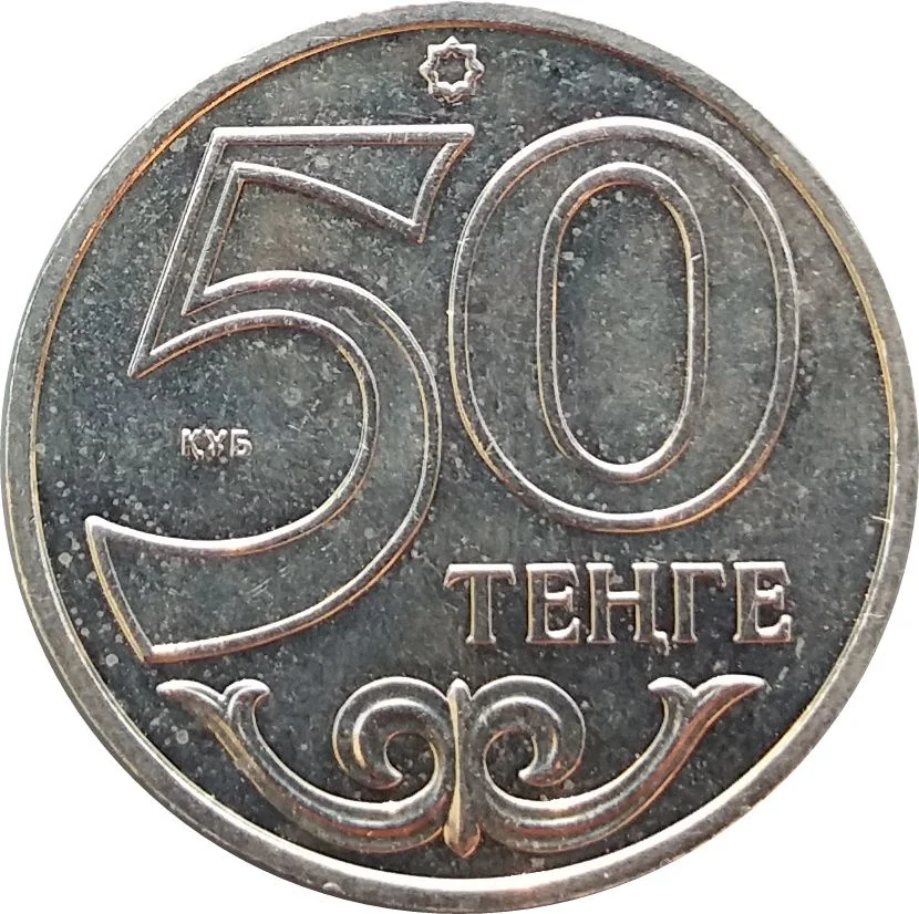 "50 ТЕҢГЕ" at center; ornamental octagon above, national ornament below; abbreviation "ҚҰБ".