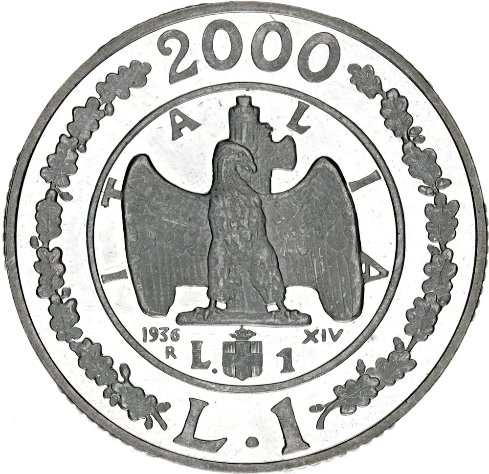 Center: 1936 1 Lira coin reverse, featuring value and fascist eagle. Outer ring: date and value opposite each other, flanked by oak branch decorations.