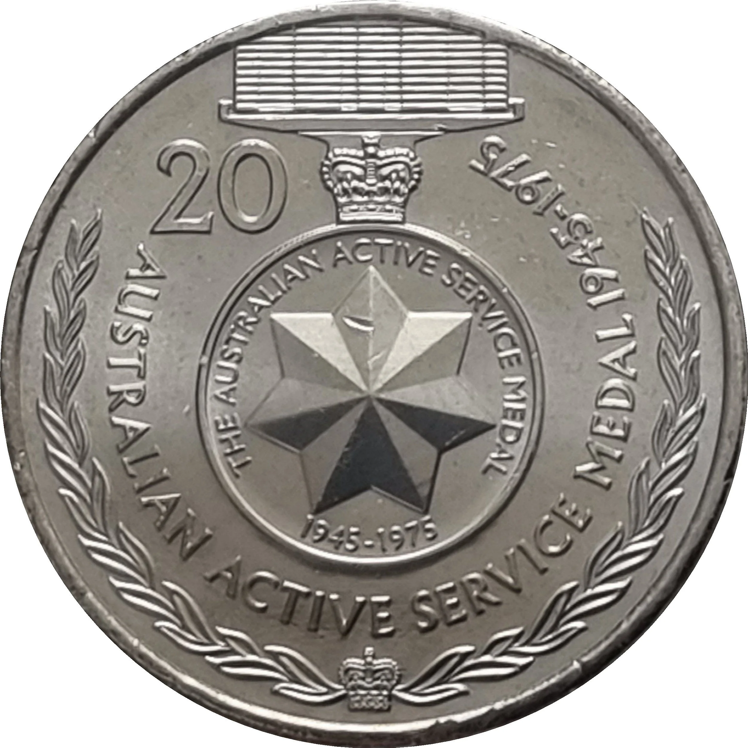 The Australian Active Service Medal 1945-1975, partially encircled by a wattle wreath and surmounted by a Royal Crown.