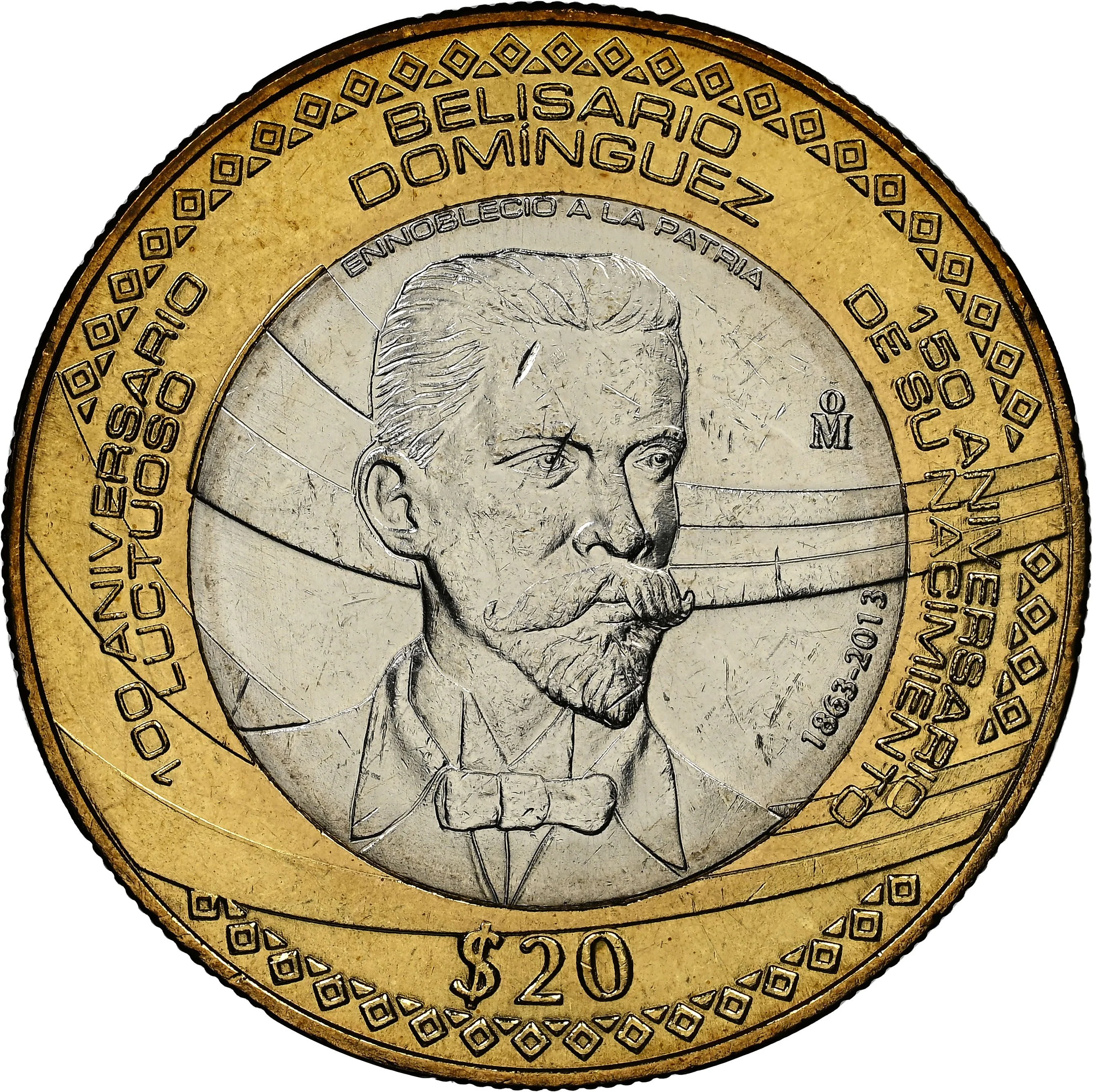 The inner coin features Belisario Domínguez's bust, encircled by "Enriqueció a la Patria" above and "1863-2013" beside the mintmark (M°). The outer ring reads "Belisario Domínguez" above, "100 Aniversario Luctuoso" left, "150 Aniversario de su Nacimiento" right, and "$20" below. The ring is decorated with quadrangular and triangular friezes.