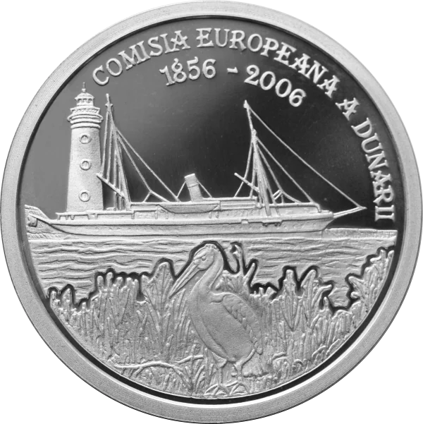A pelican in Danube Delta vegetation with the river behind. In the background, the European Commission of the Danube's inspection ship "Carolus Primus" sails near the Sulina lighthouse. Circular text above: "COMISIA EUROPEANA A DUNARII 1856 - 2006".