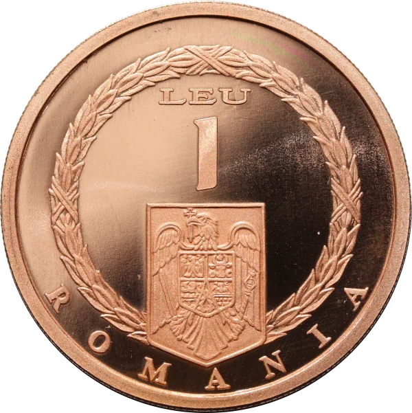 Center: "LEU 1" above the Romanian coat of arms, within a laurel wreath. Below: "ROMANIA" in an arc.