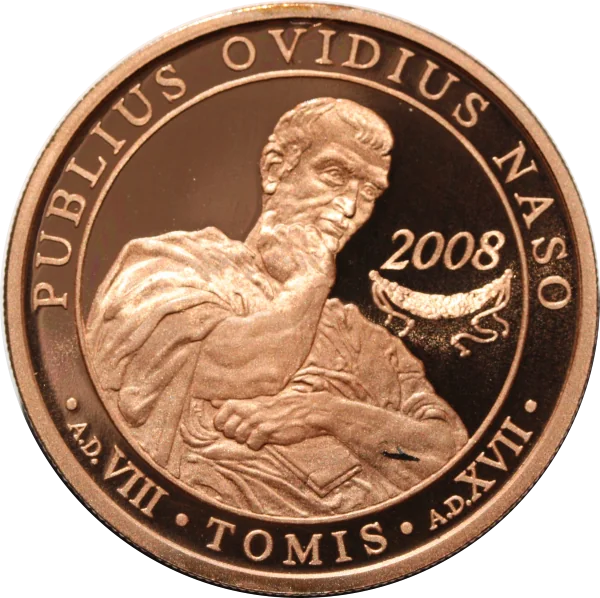 Central bust of Ovid after the Constance statue. Above, "PUBLIUS OVIDIUS NASO"; below, "o A.D. VIII o TOMIS o A.D. XVII o". Right, the year "2008" underlined by a garland.