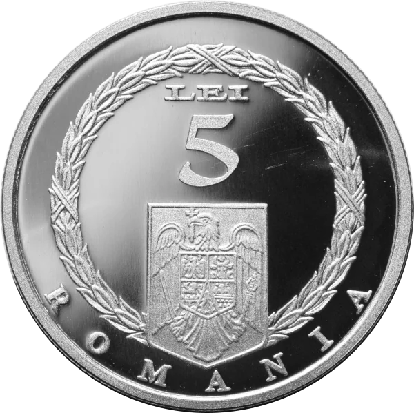 Center: "LEI 5" over the coat of arms, within a laurel wreath. Below: "ROMANIA" in an arc.