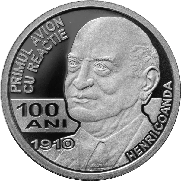 Left: "PRIMUL AVION CU REACTIE", "100 ANI", "1910". Right: Portrait and name "HENRI COANDA".