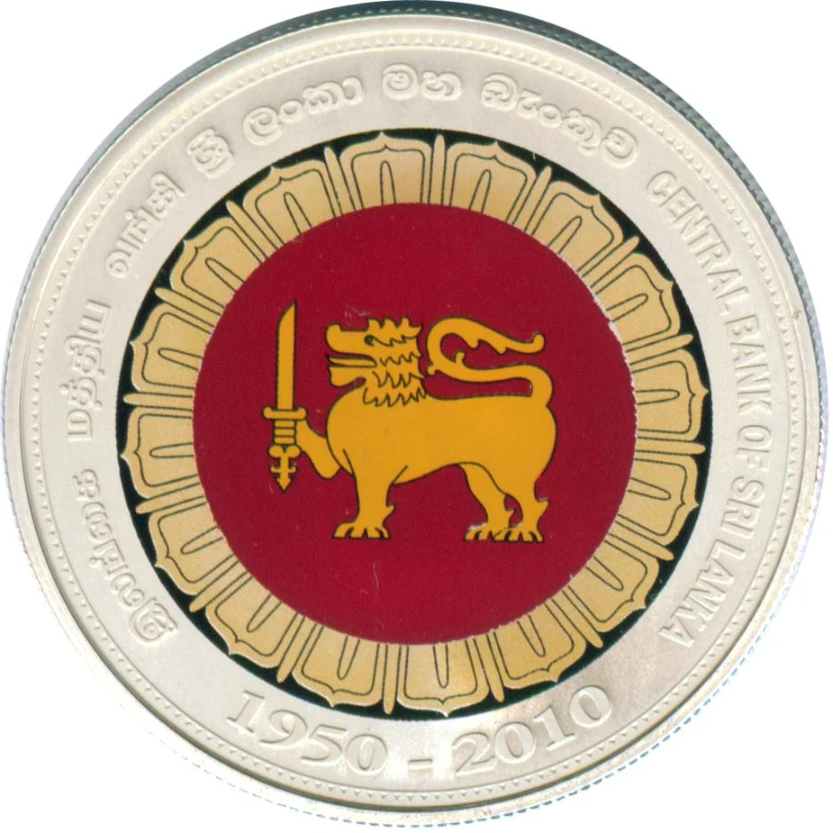 Description: Issued December 21, 2010, to mark the Central Bank of Sri Lanka's (CBSL) 60th anniversary, this is CBSL's first multi-color coin. The one-ounce sterling silver proof coin, in British crown size, features a printed color image. It is housed in a circular capsule within a 7.7 cm black rexine Royal Mint presentation box. The box lid bears the CBSL emblem in silver and "60th Anniversary - Central Bank of Sri Lanka - 1950 2010". The coin's periphery reads "CENTRAL BANK OF SRI LANKA" in Tamil, Sinhala, and English, with the CBSL crest in color and "1950-2010" at its center. A numbered, trilingual certificate of authenticity is included.