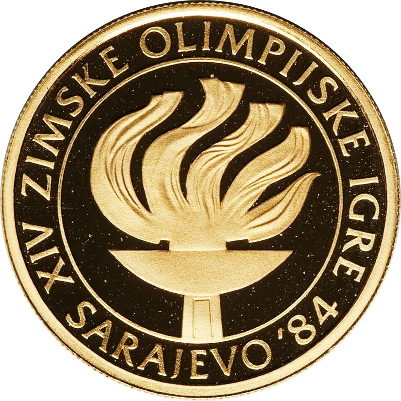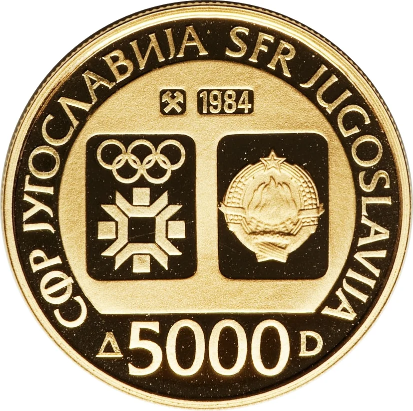 Description: Olympic logo above Sarajevo 1984 logo and SFRY coat of arms in side shields, within a flat-bottomed circle. Denomination below.