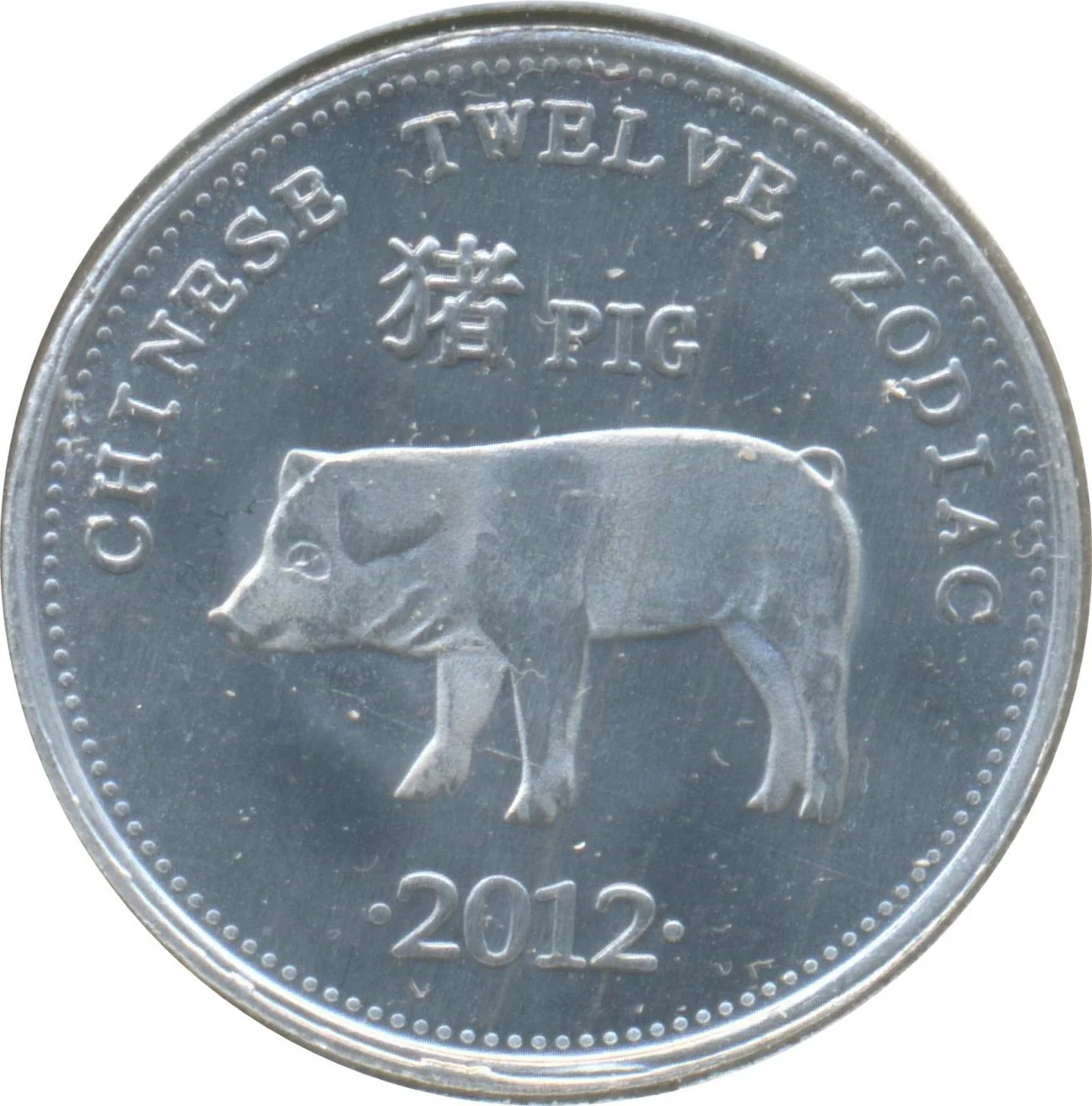Pig with Chinese character above, date below.