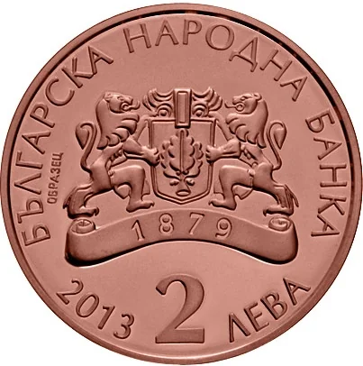 The obverse shows the BNB logo and "1879" on a central strip, encircled by "БЪЛГАРСКА НАРОДНА БАНКА," "2 ЛЕВА," and the issue year "2013."