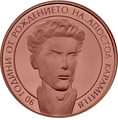 The reverse depicts actor Apostol Karamitev, encircled by the text "90 ГОДИНИ ОТ РОЖДЕНИЕТО НА АПОСТОЛ КАРАМИТЕВ".