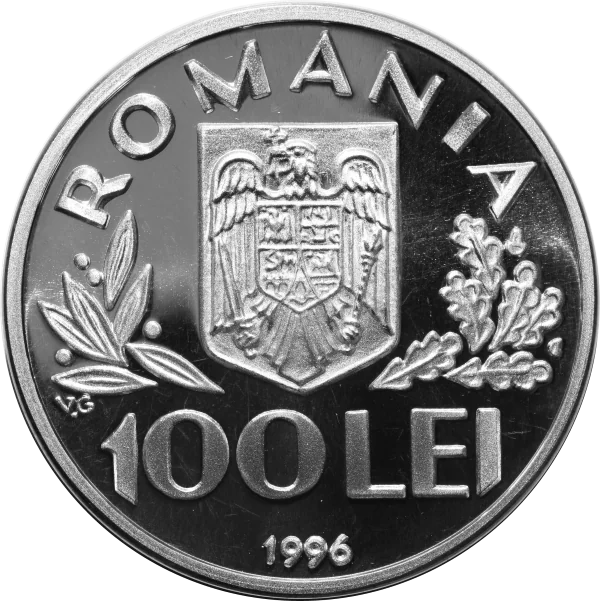 Romania's Coat of Arms centered between a left laurel and a right oak twig. Above: "ROMANIA". Below: "100 LEI" and "1996".