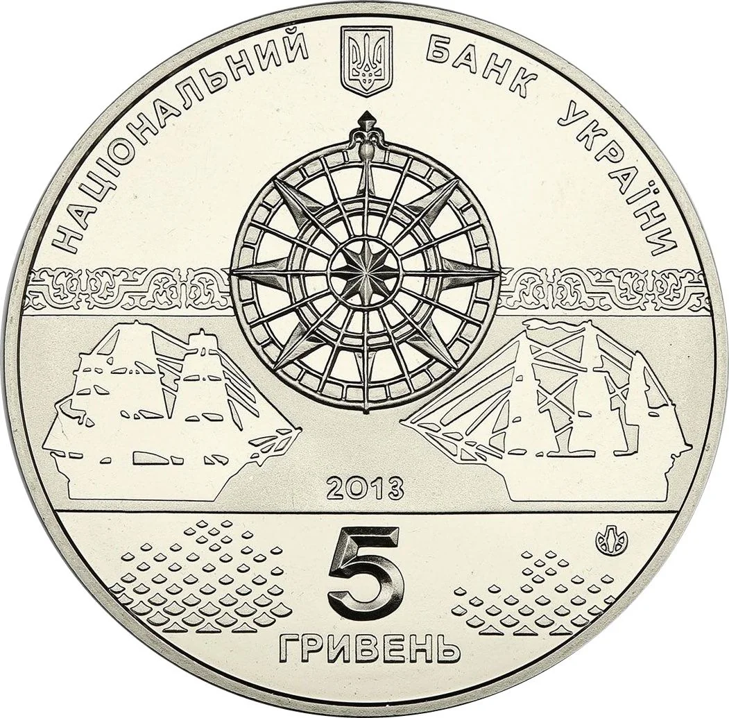 The obverse features Ukraine's Small Coat of Arms with the inscription "НАЦІОНАЛЬНИЙ БАНК УКРАЇНИ." A central wind rose, symbolizing sea travel, is flanked by sailing ships and floral patterns, with the year 2013 above. Below is the face value "5 ГРИВЕНЬ" and the Mint's mark.