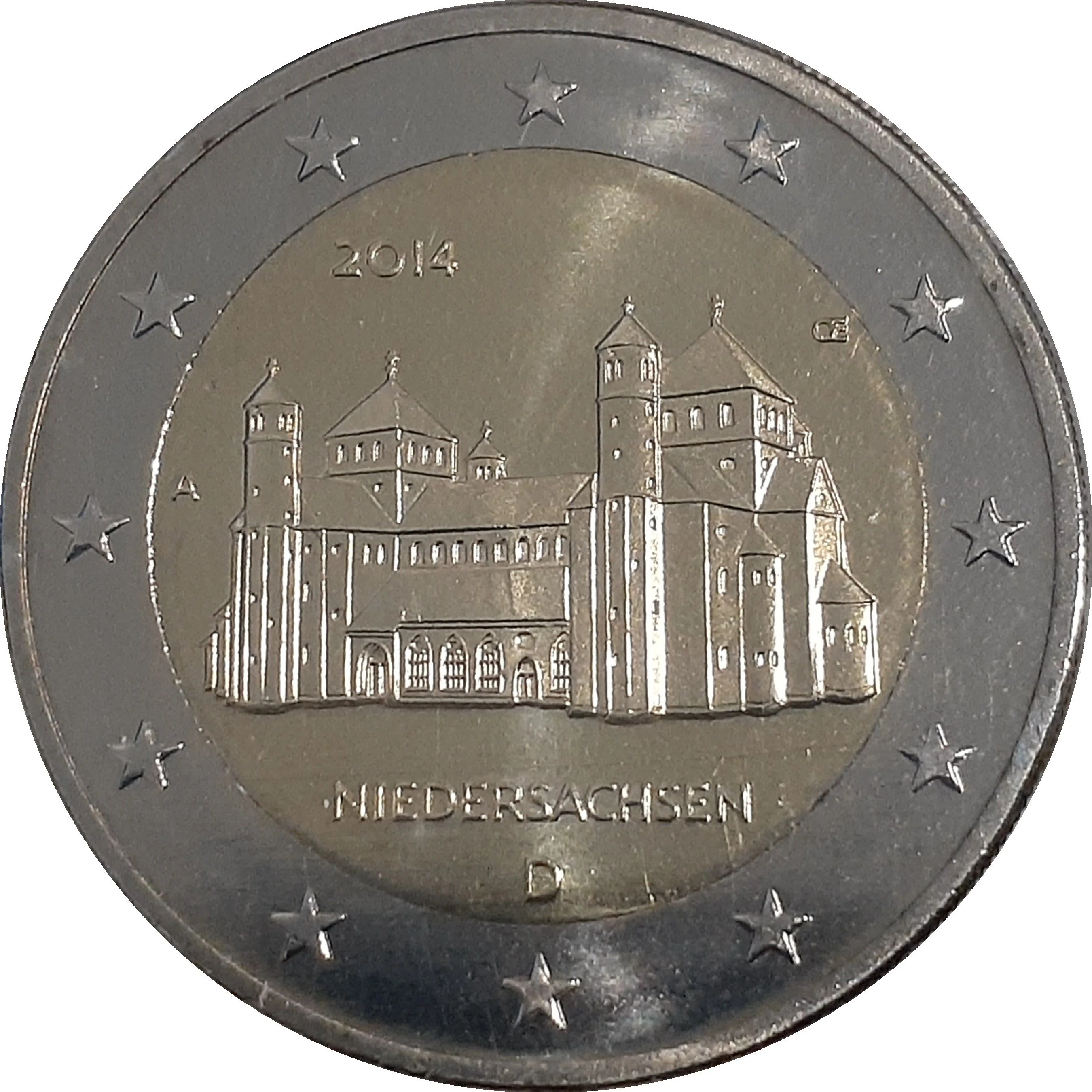 The design features St. Michael's Church in Hildesheim, a UNESCO site since 1985. The year '2014' and a mintmark are at the top left, 'NIEDERSACHSEN' and the country code 'D' are at the bottom, and the engraver's initials 'OE' are at the top right. The outer ring shows the 12 stars of the European flag.