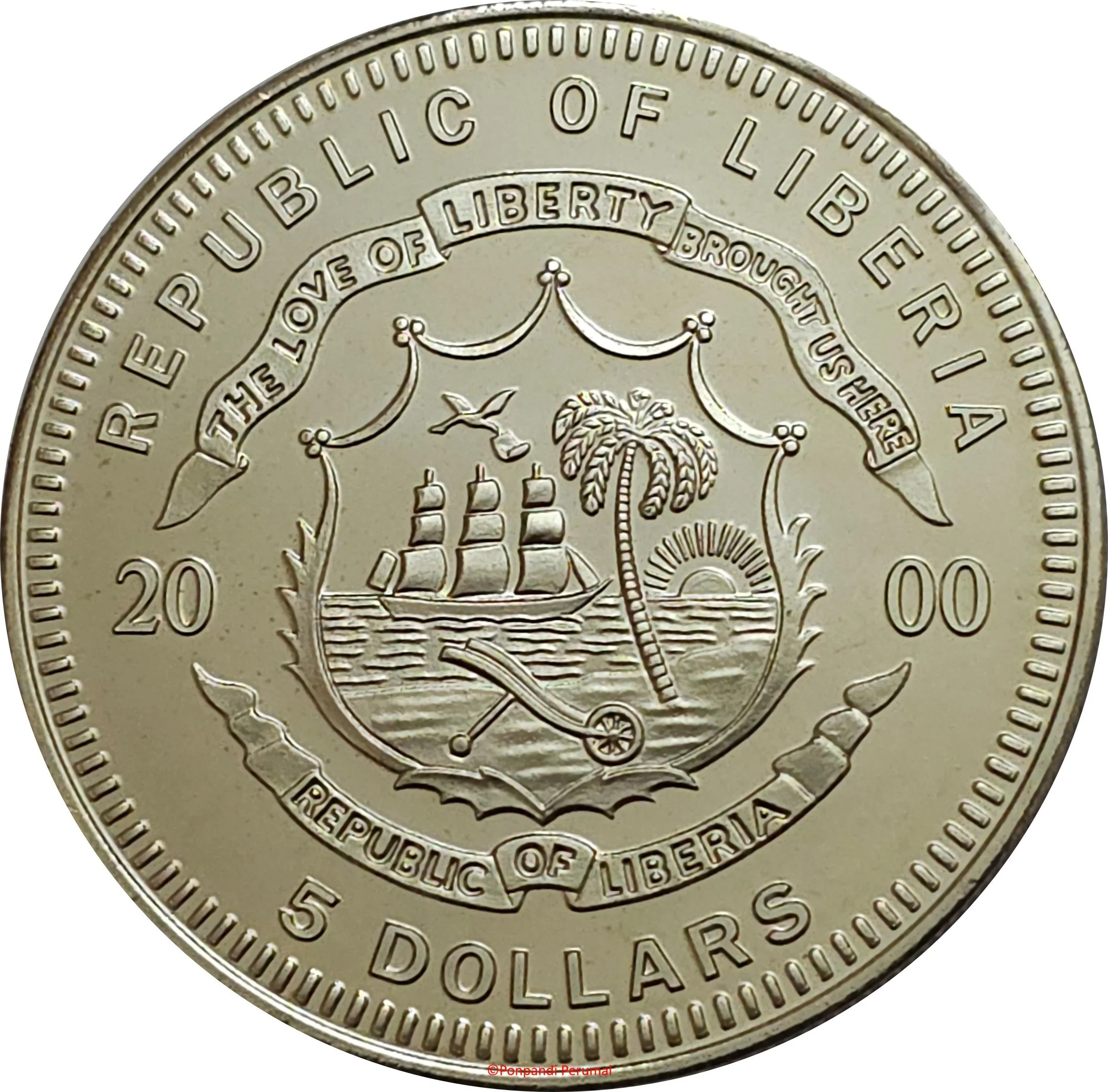 Liberian coat of arms divides date, denomination below.