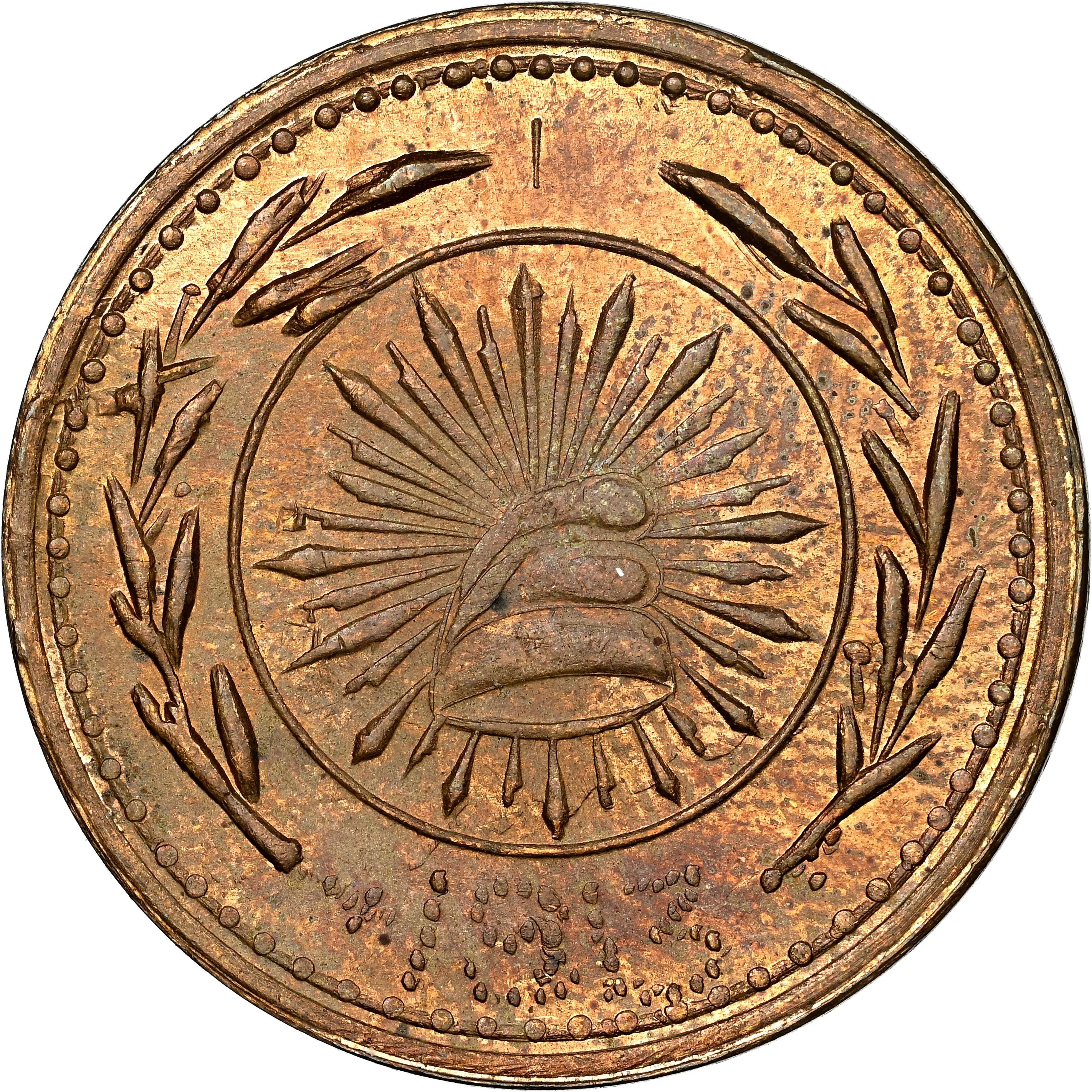 Wreath encircling cap and rays, date beneath.