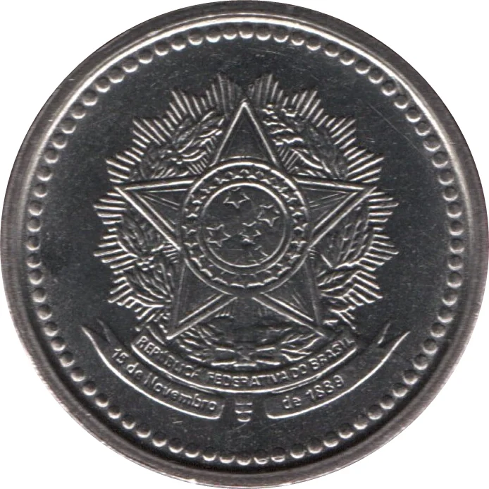 Brazil's emblem: a central star encircled by 27 smaller stars, with the Southern Cross inside, flanked by tobacco and coffee plants.