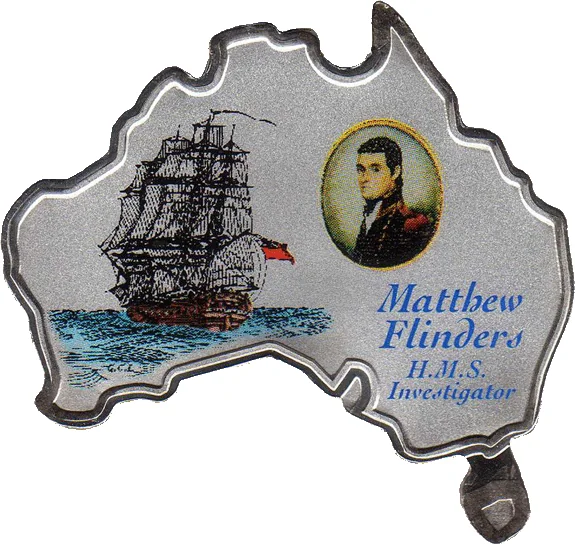 Flinders bust, upper-right. HMS Investigator at sea, left.