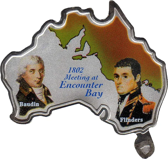 Busts of Flinders (right) and Baudin (left) flank a multicolored Encounter Bay map.