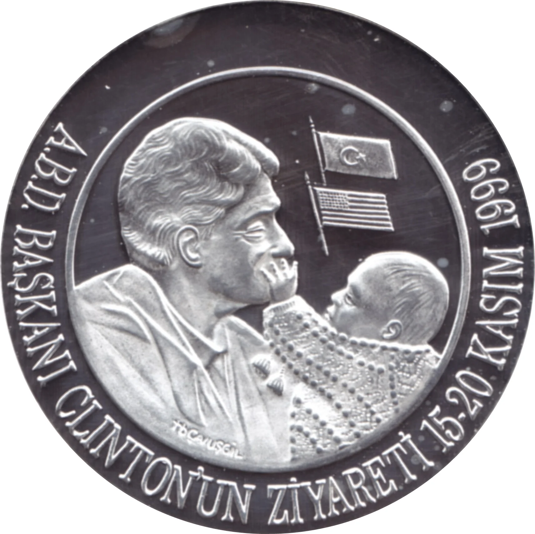 President Clinton holding a baby before U.S. and Turkish flags; commemorative text in the ring.