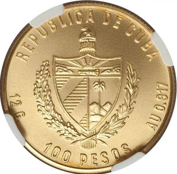 Cuban coat of arms with country name above, weight and fineness on the sides, and face value below.