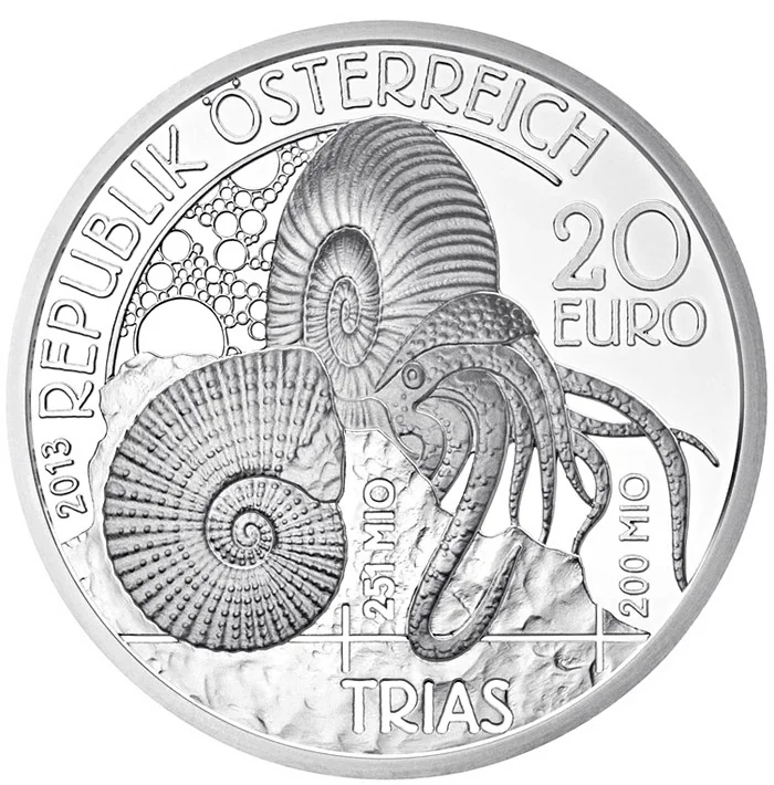 An extinct Triassic cephalopod shown as both a living animal and a fossil.
