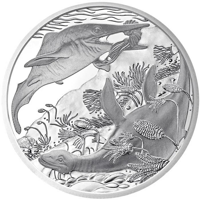 Ichthyosaurus hunting ammonite, Nothosaurus nearby.