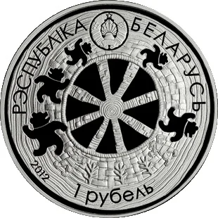 Description: Featuring the State Coat of Arms at the top. The center shows a bear and legendary figures with plaited patterns against a spinning wheel, its wheel transforming into tree rings. The year of issue is at the bottom, with circumferential inscriptions: "РЭСПУБЛІКА БЕЛАРУСЬ" above and the denomination "1 РУБЕЛЬ" below.