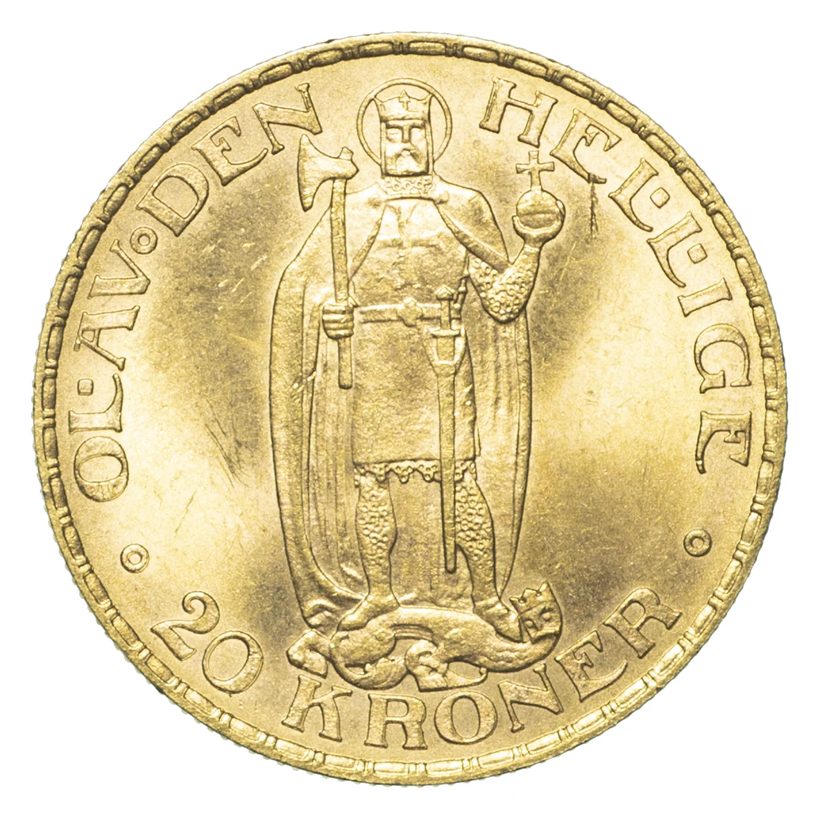 Saint Olaf with halo, axe, and globe, standing on a human-headed dragon. Inscription around, value below, wreathed rim.