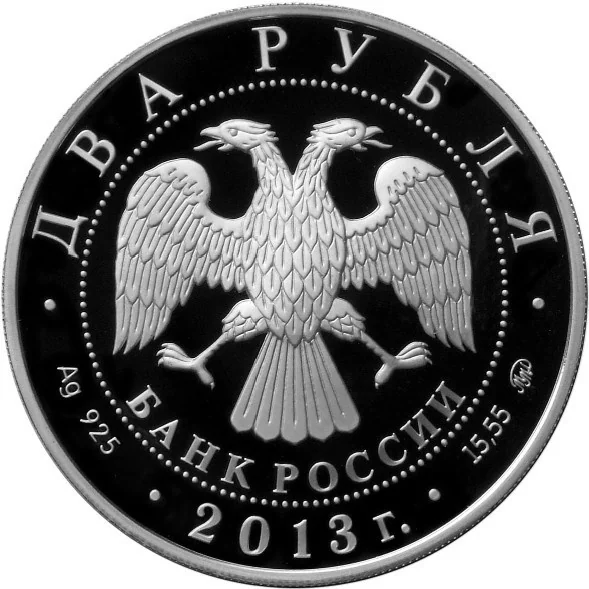 The obverse features the Bank of Russia's two-headed eagle emblem with wings down, above the semicircular inscription "БАНК РОССИИ". This is surrounded by a beaded circle. The rim inscription "ДВА РУБЛЯ" and "2013 г." frames the metal designation, purity, mint mark, and fine metal content.