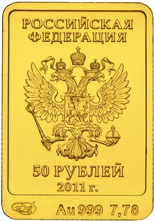 Central relief of the Russian Federation's coat of arms (a double-headed eagle with crowns, holding a sceptre and orb, bearing a shield with a horseman slaying a dragon). Above: "РОССИЙСКАЯ ФЕДЕРАЦИЯ". Below: denomination and date. Along the bottom rim: mint mark, metal/fineness, and fine metal content.