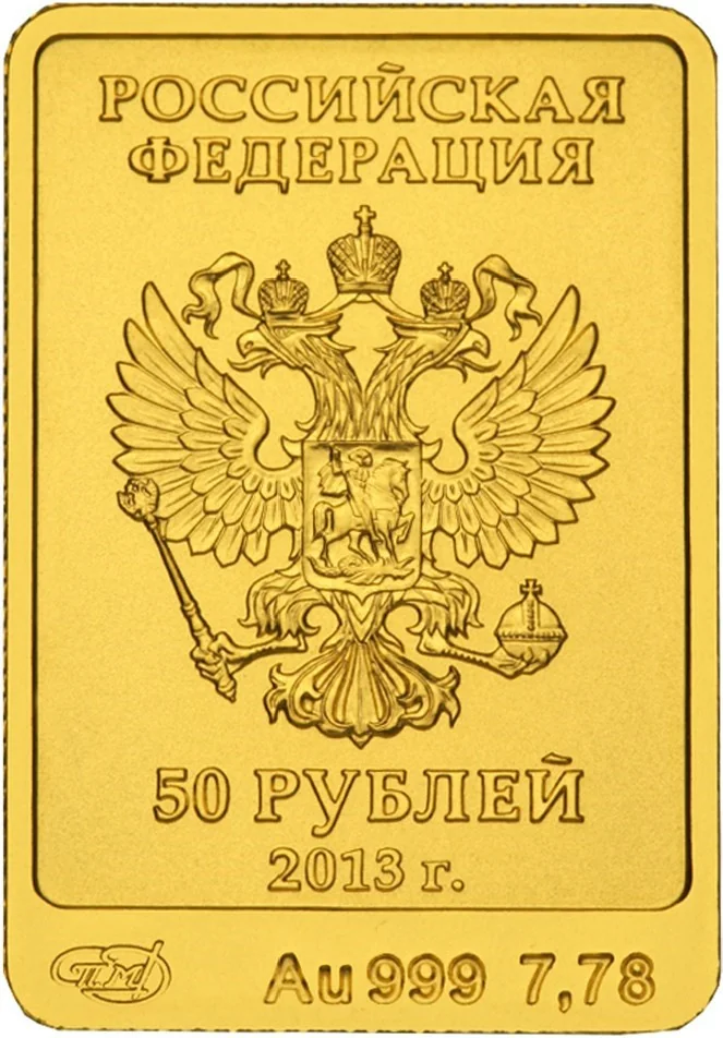 Central relief of the Russian Federation's coat of arms (a double-headed eagle with crowns, holding a sceptre and orb, bearing a shield with a horseman slaying a dragon). Above: "РОССИЙСКАЯ ФЕДЕРАЦИЯ". Below: denomination and date. Along the bottom rim: mint mark, metal/fineness, and fine metal content.