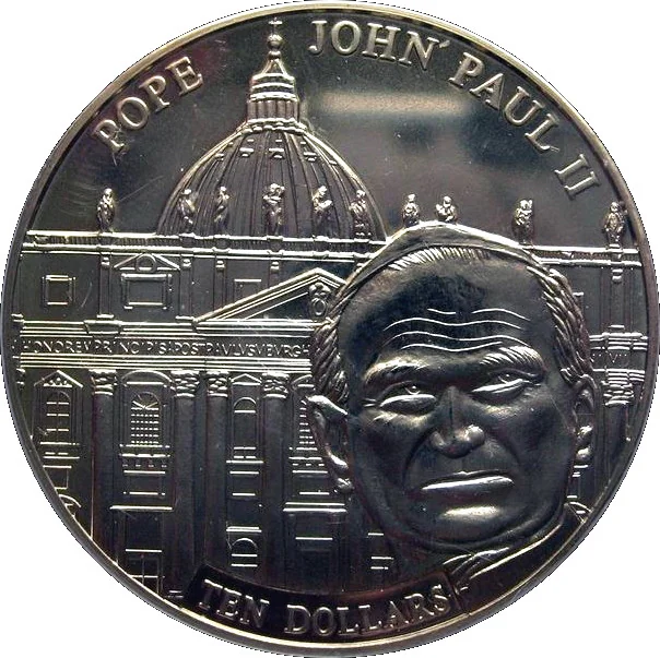 Pope John Paul II effigy before St. Peter's, denomination below.