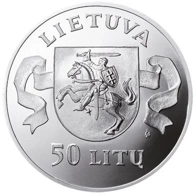 The obverse features Lithuania's coat of arms on a shield with symmetrical ribbons. "LIETUVA" is inscribed above and "50 LITŲ" below.