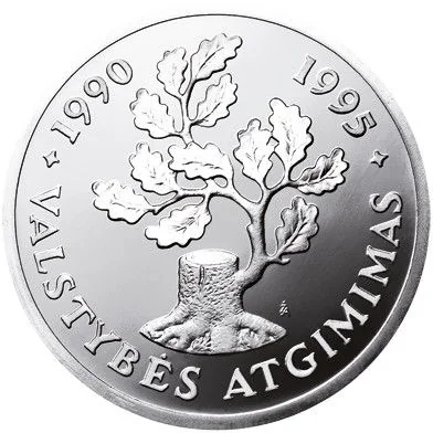 The reverse features a tree stump with new growth, surrounded by the inscriptions VALSTYBĖS ATGIMIMAS, 1990, and 1995.