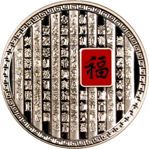 A red “Fú” (福) character for "good fortune" is in the upper right, with 13 bamboo-inspired tiers engraved with 100 variations of the same ideogram.